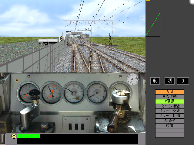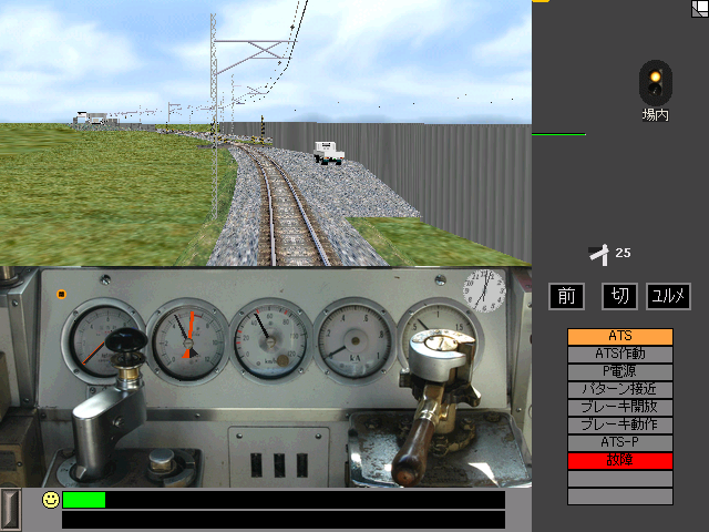 んで、出来た酷いデータ↓ ダウンロード(zip) 「導入方法」 1.BVE\Train内の、任意の車輌データフォルダをコピーします。(113_6で上等) 2.ファイルをダウンロードし、解凍、Train.datファイルを差し替えます。 3.あとは適当な路線の車輌指定を変更し、BVEを起動するだけ。 *取り扱いには注意して下さい。 運転方法 この車輌は、電気機関車をイメージした構造になっています。 ですから、通常の電車とは全く操作が異なる為、ご注意下さい。 普通にBVEだと思って操作すると、ほぼ確実に爆滅します。 「出発」 1.通常通り戸締めを確認します。 2.リバーサ前&1秒間だけマスコン1を入れ、速度が1km/hになったらノッチオフします。 3.そしたらすぐにリバーサ後に切り替え、ブレーキを8までかけます。 ===あとはお楽しみ!!うふふふふふ。 「惰性走行」 通常のBVEと基本的に同じです。 「減速&停車」 リバーサ後ろを確認した上で、マスコンを5程度まで投入して減速します。 0km/hになる直前でノッチオフし、速度がマイナス(バックする)にならないようにしましょう。 っていう読んだだけでは意味不明な運転をします。 まあ、1回やってみれば分かるでしょう。 くれぐれも心臓発作で倒れないようにご注意下さい。 [注意/警告] このデータはBVE2.6でのみ動作を確認しています。BVE4では保証外です。 かなり大変な改造をしていますので、動作不良があっても保証外です。 フリーズなどが起こらない事は確認していますが、使用は自己責任でお願いします。(やったらキモイとかいうクレームも無しネ)